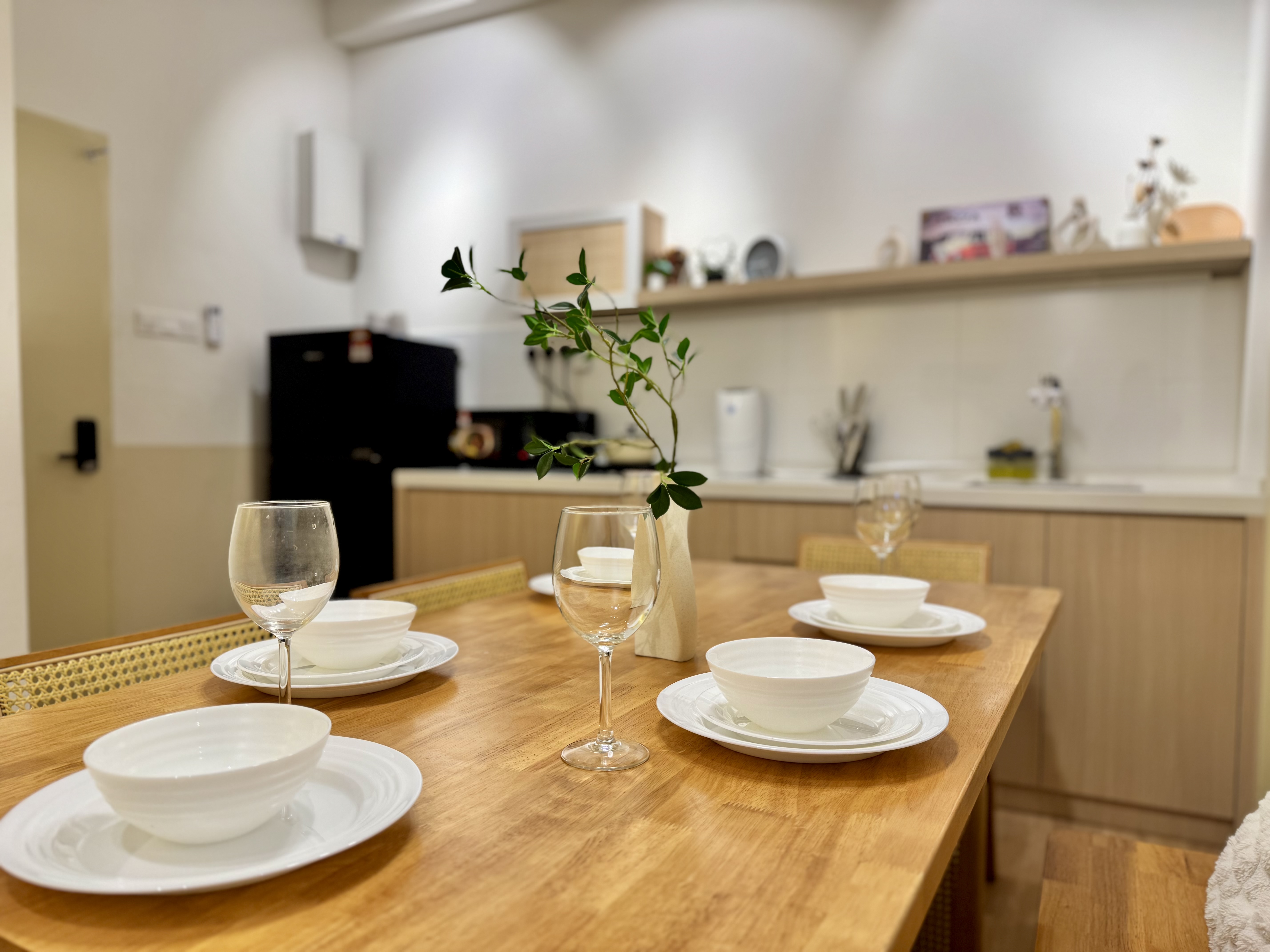 Each elegantly designed suite boasts a fully equipped kitchen with a microwave, toaster, fridge, and essential kitchenware, making it perfect for extended stays. The living area includes a flat-screen TV with streaming services, a dining space, and a private bathroom with a bidet, slippers, and fresh linens for added convenience.